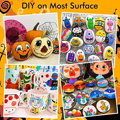 - 【MULTI-PURPOSE】: Enjoy creating art projects on a variety of surfaces, acrylic paint marker set suitable for rock painting, ceramic and mug painting, glass and wine glass painting, wood, fabric, stone, metal, plastic, canvas, Christmas ornament, Halloween pumpkin painting, calligraphy, scrapbook, bullet journal, brush lettering, custom mugs, DIY crafts projects, and much more for both smooth and porous surfaces.
