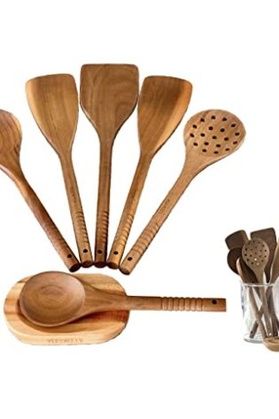 VERY NITTY Very Beautiful Kitchen Utensil Set, 7pc Wooden Cooking Utensils, Spoons and Spatula Set with Spoon Rest. Wood Kitchen Gadgets, Tools and Supplies for Cooking, Baking, Mixing and Salad Bowl